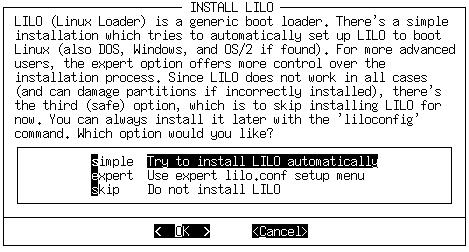 If this is your first time setting up LILO, you should pick “simple”. Otherwise, you might find “expert” to be faster if you are familiar with LILO and Linux. Selecting “simple” will begin the LILO configuration.